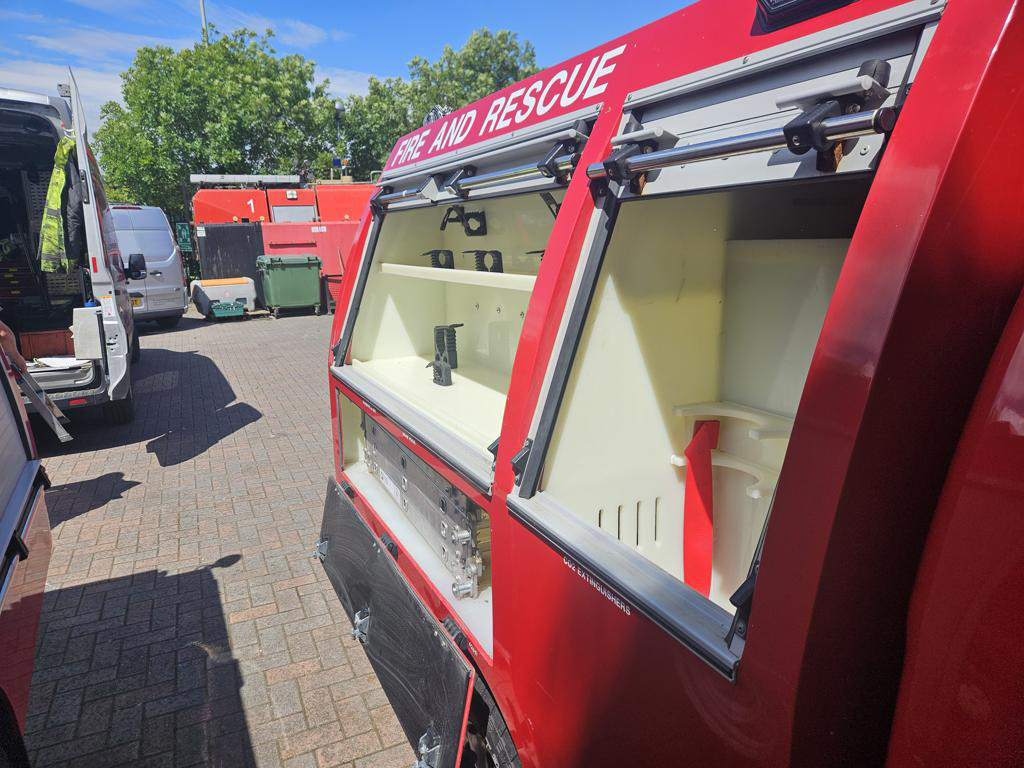 Bespoke colour coded polypropylene rear body with six internal lockers for kit and equipment storage (Equipment shown not included).
